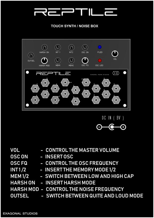 Dimensions: 220 x 150 x 60 mm Standar case : BIOPLASTIC 3D PRINTED CASE Color : BLACK Front panel : 1 power blue led, 1 oscillator red led, 3 knob, 7 switch, 1 touch plate with 18 tactile sensors Rear panel : 1 audio output jack, 1 power switch, 9V DC jack ( CENTER POSITIVE ) |